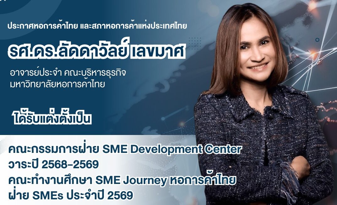 รศ.ดร.ลัดดาวัลย์ เลขมาศ ผู้อำนวยการศูนย์เอสเอ็มอี ได้รับการแต่งตั้งเป็น คณะกรรมการฝ่าย SME Development Center และ คณะทำงานศึกษา SME Journey หอการค้าไทย ฝ่าย SMEs